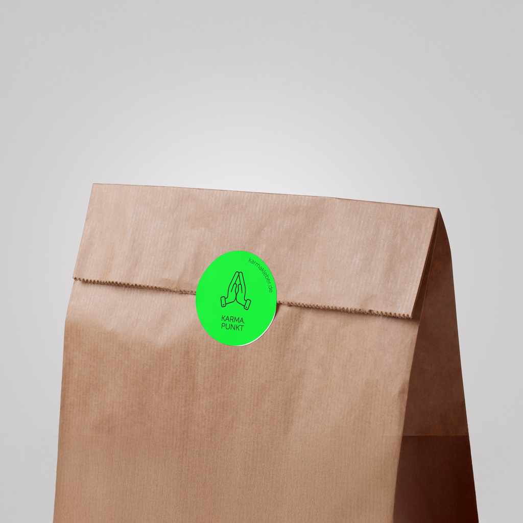Ein großer Karma-Punkt in Gelb (Ø 8 cm) für dein Statement-Piece + drei kleine in Neon-Grün (Ø 4 cm) für Alltag und zum Verschenken. Mit jedem Set fließen 50 Cent an wohltätige Projekte in den Bereichen Umwelt, Soziales, Bildung und Tierschutz.